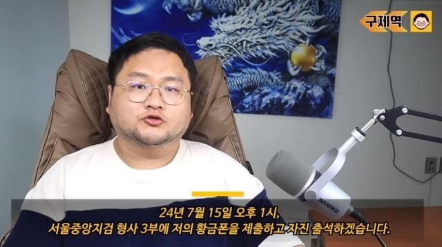 이와 대해 구제역은 전날 자신의 유튜브 채널에 "서울중앙지검 형사 3부에 '황금폰' 제출하고 자진 출